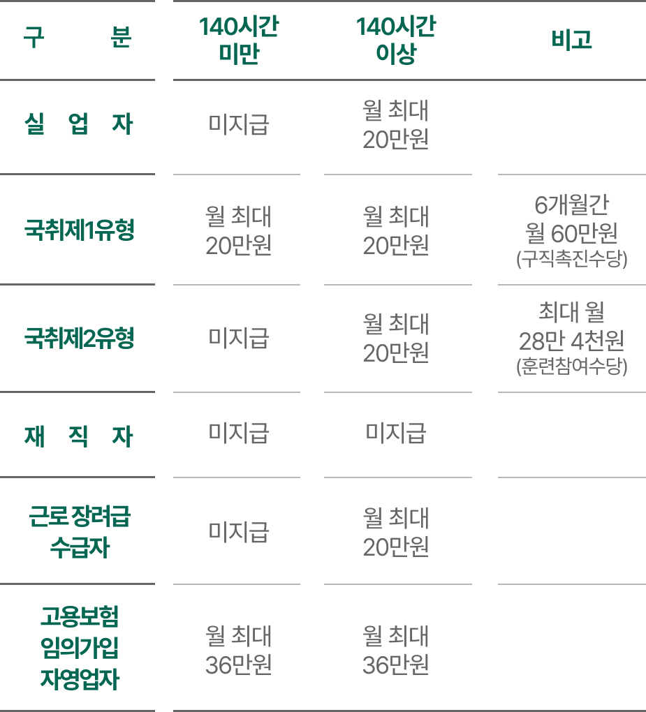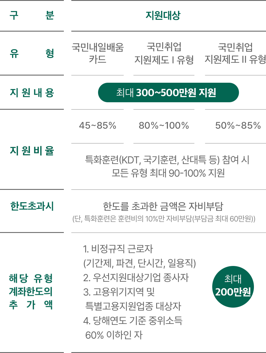 국비지원제도 안내 이젠컴퓨터학원의 모든 국비지원 과정은 NCS과정을 준수합니다. 국민내일배움카드 K-디지털 트레이닝 국가기간·전략산업직종 훈련 국민취업지원제도 국민내일배움카드 안내 훈련과정의 질도 UP! 자기부담금도 합리적으로! 누구나 국민내일배움카드 신청 가능! 국민 내일배움카드란? 취업에 필요한 직무능력 교육을 받고, 취업 후에도 직장인으로서 산업 현장에 필요한 직무 이행 능력을 기를 수 있도록 교육 및 훈련 비용을 지원하는 카드입니다. 지원대상이 알고 싶습니다. "직업훈련을 희망하는 대한민국 국민이면 누구나 신청가능합니다. 지금 이글을 읽고 있는 여러분도 이미 지원대상입니다" 대상 제외 단, 공무원, 사립학교 교직원, 졸업예정자 이외 재학생, 사업 기간이 1년 미만이거나 연 매출 4억 이상의 자영업자, 월 임금 300만원 이상인 대기업 근로자(45세 미만), 월 소득 500만원 이상의 특수형태 근로종사자, 75세 이상 제외 지원내용이 궁금합니다. 1. 카드 신청시 지원대상에 따라 훈련비용지원 2. 훈련비용 외 별도로 훈련수당을 지원 특화과정 참여 시: 특별훈련수당 월 10-30만원 추가 지급 (수도권 +10만원 / 비수도권 +20만원 / 인구감소지역 +30만원) 저소득 재직자(근로장려금 수급자) - 140시간 이상인 훈련과정에 참여하는 경우 훈련수당 지원(출석률 80%이상). 실업자 - 140시간 미만 훈련과정에 참여하는 경우 미지원. 실업자가 재직자로 변경 시 소득이 발생하므로 훈련수당은 미지급. 근로장려금 수급자는 경제활동 상태가 변경(실업>재직) 시 훈련수당 지급. 훈련신청절차가 궁금합니다. 주의: 카드발급 관련 문의는 본 학원이 아닌, 고용24(www.work24.go.kr) 또는 주소지 관할 고용센터를 통해 문의 부탁드립니다. K-디지털 트레이닝 훈련과정의 질도 UP! 자기부담금도 합리적으로! 누구나 국민내일배움카드 신청 가능! K-Digital Training이란? 디지털 신기술 분야 (AI, 반도체, 로봇,빅데이터 )에서 활용되는 기술을 실전에서 활용할 수 있도록 다양한 훈련과정을 제공하는 제도입니다. 지원대상이 알고 싶습니다. 국민내일배움카드가 있으면 누구나 신청가능 가능합니다. 국민내일배움카드 발급 자격을 확인해보세요. 대상 제외 *단, 공무원, 사립학교 교직원, 졸업예정자 이외 재학생, 사업 기간이 1년 미만이거나 연 매출 4억 이상의 자영업자, 월 임금 300만원 이상인 대기업 근로자(45세 미만), 월 소득 500만원 이상의 특수형태 근로종사자, 75세 이상 제외 지원내용이 궁금합니다. 1. 훈련비 지원 한도 외 우선 지원: K-디지털 트레이닝(KDT) 참여 시, 개인별 내일배움카드 계좌 한도 소진 여부와 관계없이 최초 1회에 한해 훈련비 우선 지원 정부 지원 비율: 전체 훈련비의 90% 이상을 정부에서 지원하며, 참여자는 나머지 10%의 자기부담금 납부 부담 상한액 설정: 훈련비 총액에 관계없이 본인부담금은 최대 60만 원을 초과할 수 없도록 제한 2. 훈련수당 지급 월별 소정 훈련일수의 80% 이상 출석한 경우 월 최대 20만원까지 훈련 장려금 지급 지역별 특별훈련수당 10-30만원 지급 (수도권 +10만원 / 비수도권 +20만원 /인구감소지역 +30만원)) 훈련수당+특별훈련수당월 최대 500,000원 국민취업지원제도 월 최대 600,000원 3. 취업성공시 성공수당 지급 [국민취업지원제도 I] 참여자에게 해당 (국민취업지원제도 II 참여자도 요건 충족시 지급) 국민취업지원제도 지원 사업 종료 후 3개월 이내 취업한 경우 지급 취업한 직장에서 6개월 근무시 50만원, 이후 추가 6개월 근속시 100만원 총 12개월 계속 근무시 총 150만원이 지급 됨 취업 성공 수당 최대 1,500,000원 훈련신청절차가 궁금합니다. 주의: 카드발급 관련 문의는 본 학원이 아닌, 고용24(www.work24.go.kr) 또는 주소지 관할 고용센터를 통해 문의 부탁드립니다. 국가기간·전략산업 직종훈련 훈련과정의 질도 UP! 훈련비도 합리적으로! 훈련비, 교재비까지 전액무료 국비지원교육! 국가기간·전략산업직종훈련이란? 취업을 목적으로 기업들이 요구하는 수준의 훈련을 지원하는 제도입니다. 지원대상이 알고 싶습니다. "취업을 희망하는 국민내일배움카드발급자이면 대한민국 국민이면 누구나 신청가능합니다." 지원내용이 궁금합니다. 1. 훈련비 지원 한도 외 우선 지원: 국가기간·전략산업직종훈련 (국기훈련) 참여 시, 개인별 내일배움카드 계좌 한도 소진 여부와 관계없이 최초 1회에 한해 훈련비 우선 지원 정부 지원 비율: 전체 훈련비의 90% 이상을 정부에서 지원하며, 참여자는 나머지 10%의 자기부담금 납부 부담 상한액 설정: 훈련비 총액에 관계없이 본인부담금은 최대 60만 원을 초과할 수 없도록 제한 2. 훈련수당 지급 월별 소정 훈련일수의 80% 이상 출석한 경우 월 최대 20만원까지 훈련 장려금 지급 지역별 특별훈련수당 10-30만원 지급 (수도권 +10만원 / 비수도권 +20만원 /인구감소지역 +30만원)) 훈련수당+특별훈련수당월 최대 500,000원 국민취업제도월 최대 600,000원 3. 취업성공시 성공수당 지급 [국민취업지원제도 I] 참여자에게 해당 (국민취업지원제도 II 참여자도 요건 충족시 지급) 국민취업지원제도 지원 사업 종료 후 3개월 이내 취업한 경우 지급 취업한 직장에서 6개